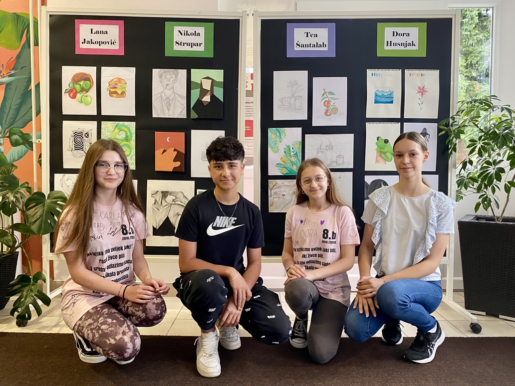 Početkom mjeseca lipnja postavljena je u školi likovna izložba talentiranih učenika osmih razreda. Likovne radove iz vlastite kreativne radionice pokazala su nam četiri učenika: Lana Jakopović, Tea Šantalab, Dora Husnjak i Nikola Strupar.