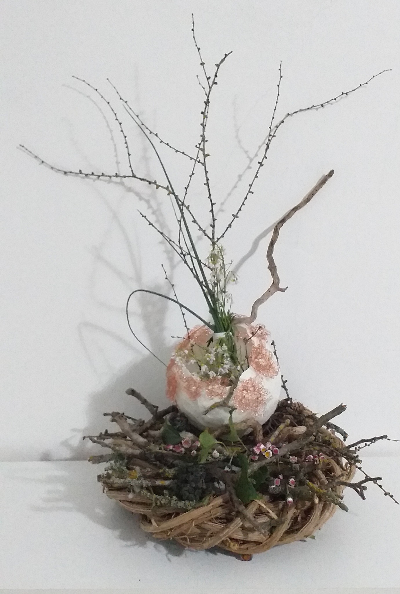 Ovogodišnja pisanica naših zadrugara izrađena je tehnikom kaširanja, obojana bijelom akrilnom bojom i polakirana. Ukrašena je heklanim cvjetovima od tanke bakrene žice. Smještena je na obruč od breze i veliki obruč od lijane ukrašen grančicama ariša, bršljana i oraha. Dodatak su cvjetovi tratinčica i bijelo poljsko cvijeće.
